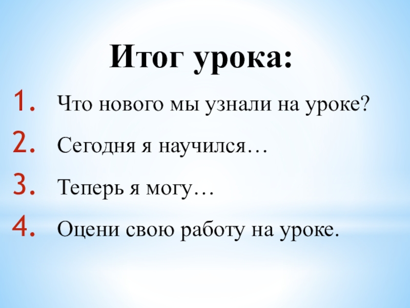 Итог урока:Что нового мы узнали на уроке?Сегодня я научился…Теперь я могу…Оцени свою работу на уроке.