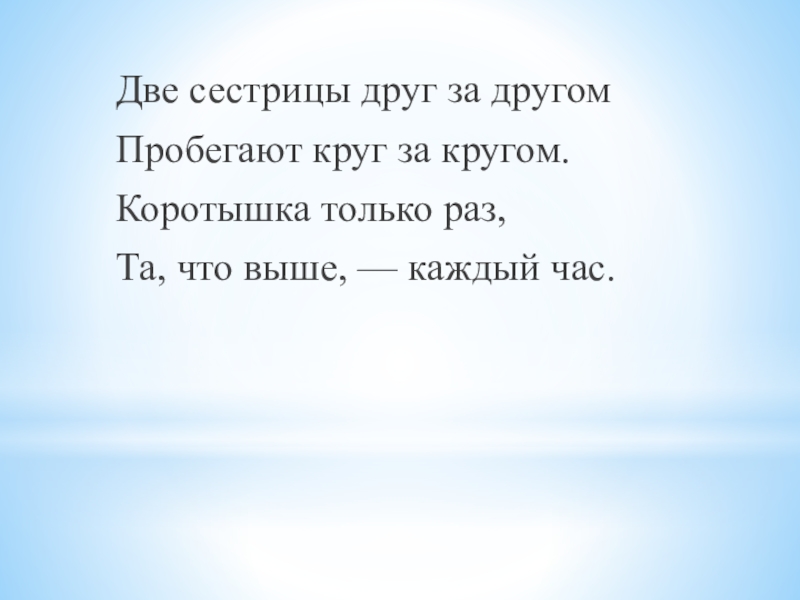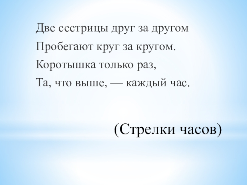 (Стрелки часов)Две сестрицы друг за другомПробегают круг за кругом.Коротышка только раз,Та, что выше, — каждый час.
