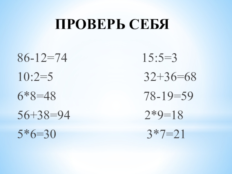 ПРОВЕРЬ СЕБЯ86-12=74            15:5=310:2=5