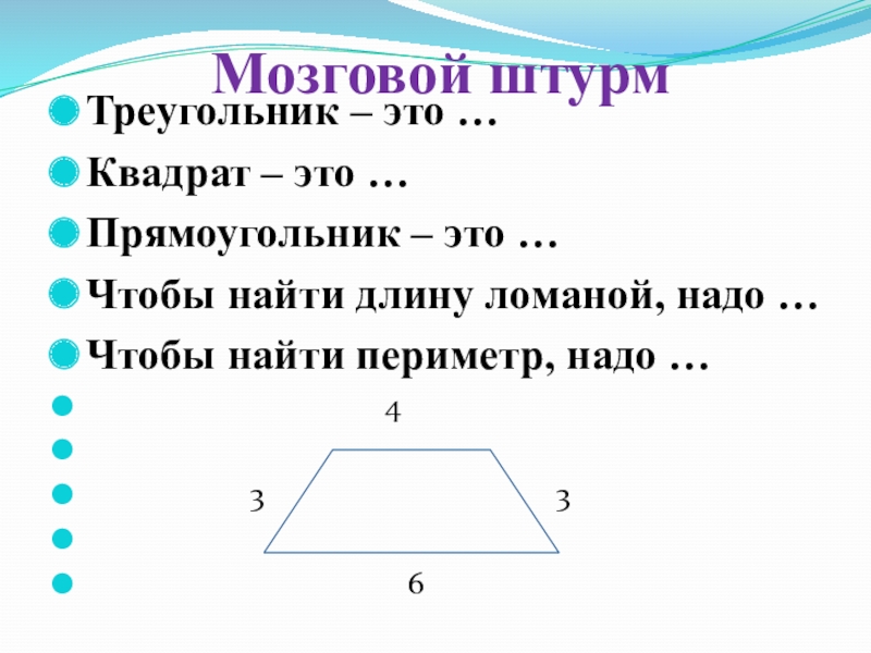 Мозговой штурм Треугольник – это …Квадрат – это …Прямоугольник – это …Чтобы найти длину ломаной, надо …Чтобы найти периметр, надо …