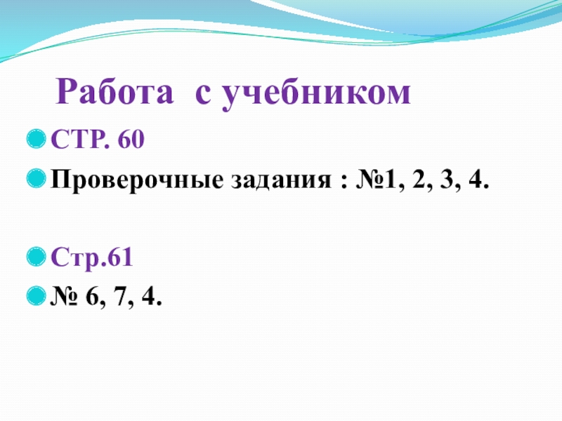 Работа с учебником СТР. 60Проверочные задания : №1, 2, 3, 4.Стр.61 № 6, 7, 4.
