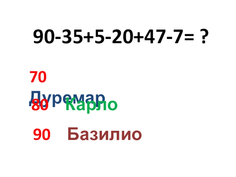 90-35+5-20+47-7= ?70   Дуремар80  Карло90  Базилио