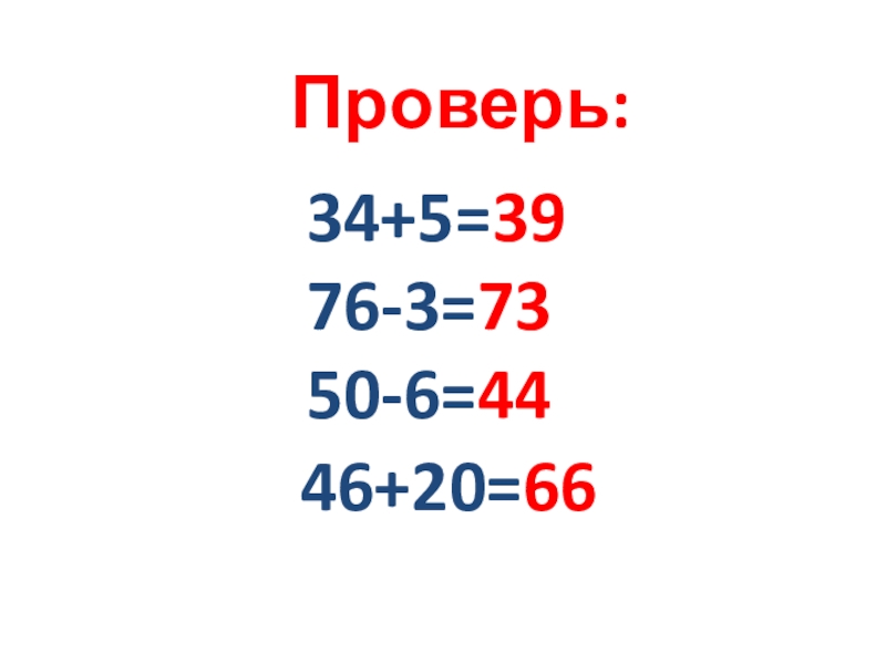 34+5=3976-3=7350-6=44     46+20=66Проверь: