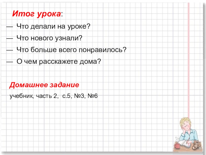 Итог урока: Что делали на уроке?Что нового узнали?Что больше всего понравилось?О чем расскажете дома? Домашнее задание