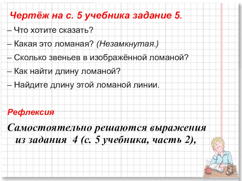 Чертёж на с. 5 учебника задание 5. – Что хотите сказать? – Какая это ломаная? (Незамкнутая.)–