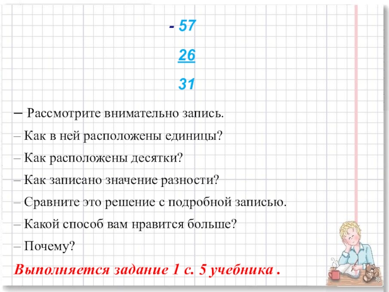 - 57  26  31– Рассмотрите внимательно запись.– Как в ней расположены единицы?– Как расположены десятки?–