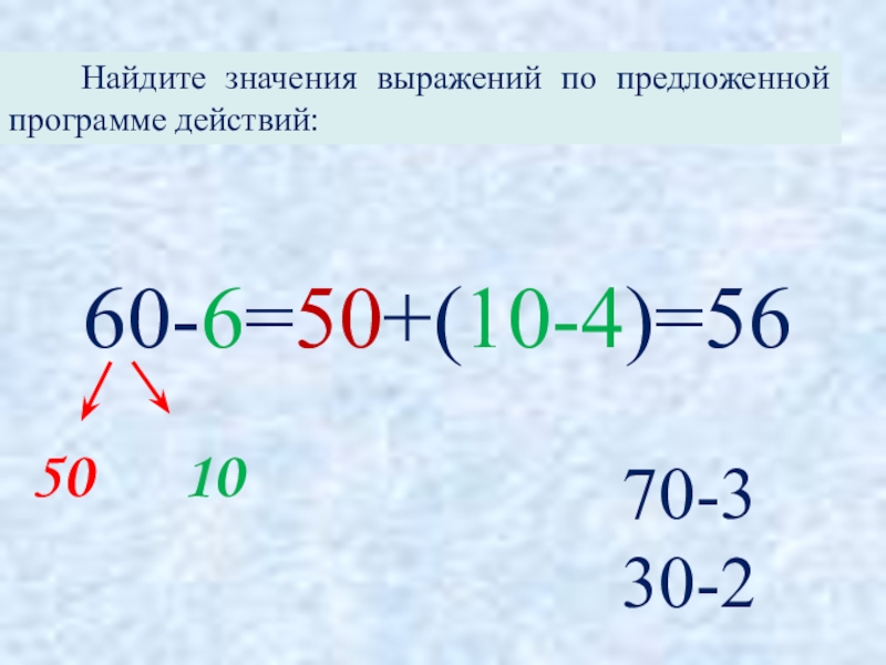 60-6=50+(10-4)=56  Найдите значения выражений по предложенной программе действий:70-330-2 50   10