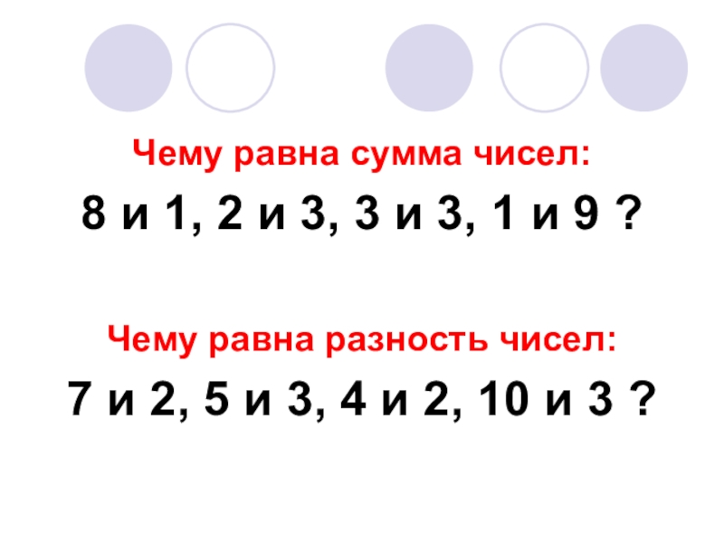 Чему равна сумма чисел:8 и 1, 2 и 3, 3 и 3, 1 и 9 ?Чему равна