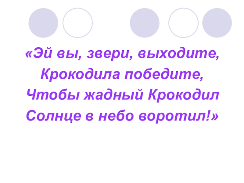 «Эй вы, звери, выходите,Крокодила победите,Чтобы жадный КрокодилСолнце в небо воротил!»