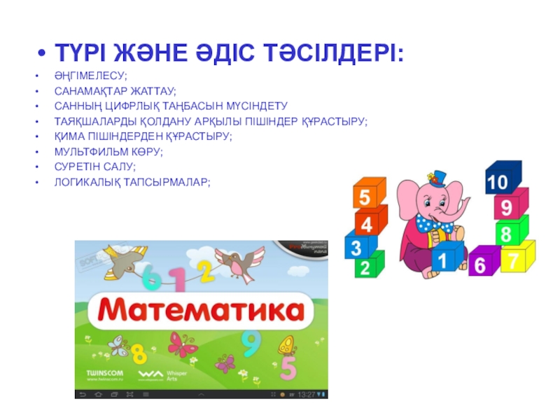 математикалық ертегі, логикалық тапсырмалар, қызықты жаттығулар, дидактикалық ойындар, есептер, геометриялық пішіндер туралы танымдық қабілеттерін дамытуға мүмкіндік береді.