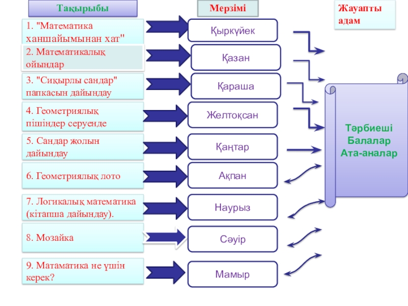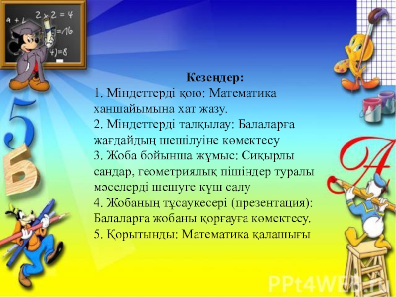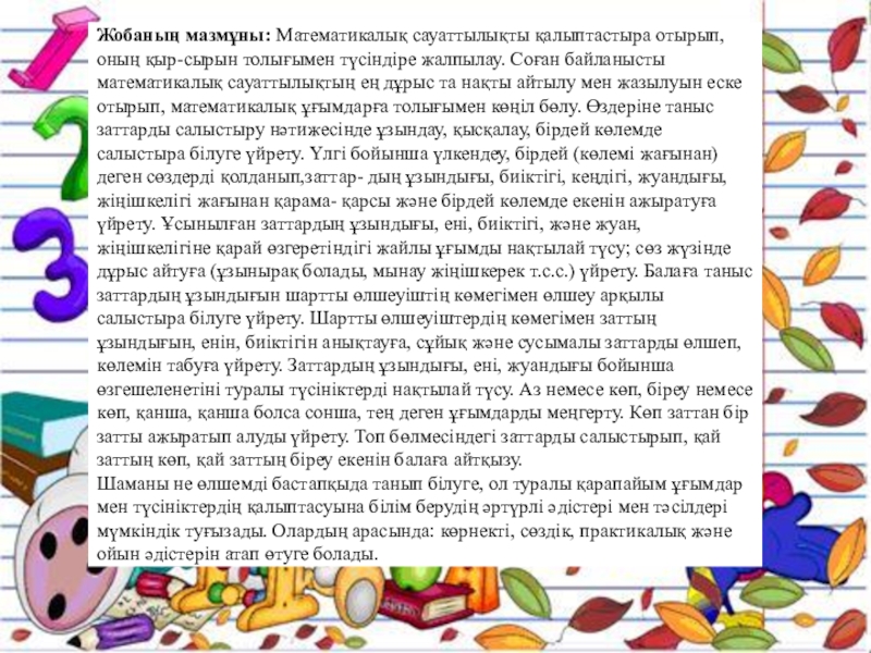 Жобаның мазмұны: Математикалық сауаттылықты қалыптастыра отырып, оның қыр-сырын толығымен түсіндіре жалпылау.