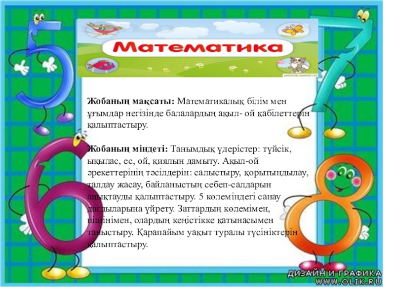 Слайд 3Жобаның мақсаты: Математикалық білім мен ұғымдар негізінде балалардың ақыл- ой қабілеттерін