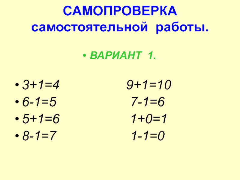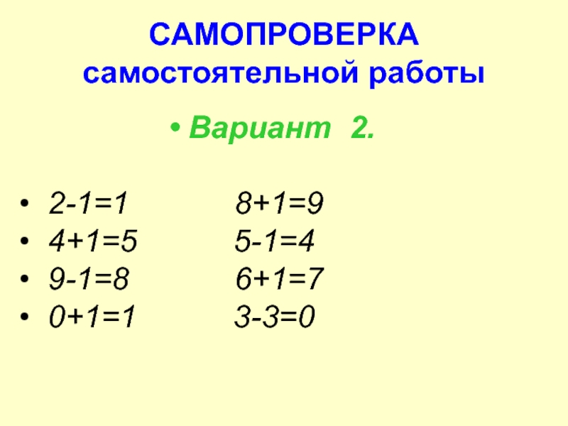 САМОПРОВЕРКА самостоятельной работы Вариант 2. 2-1=1      8+1=9 4+1=5