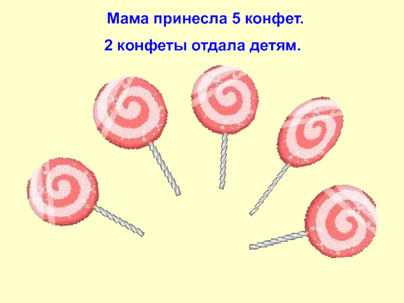 Мама принесла 5 конфет. 2 конфеты отдала детям.