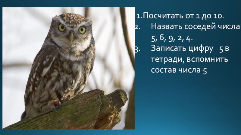 1.Посчитать от 1 до 10.Назвать соседей числа 5, 6, 9, 2, 4.Записать цифру  5 в тетради,