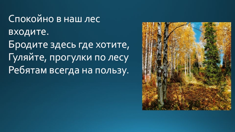 Спокойно в наш лес входите.Бродите здесь где хотите,Гуляйте, прогулки по лесу Ребятам всегда на пользу.