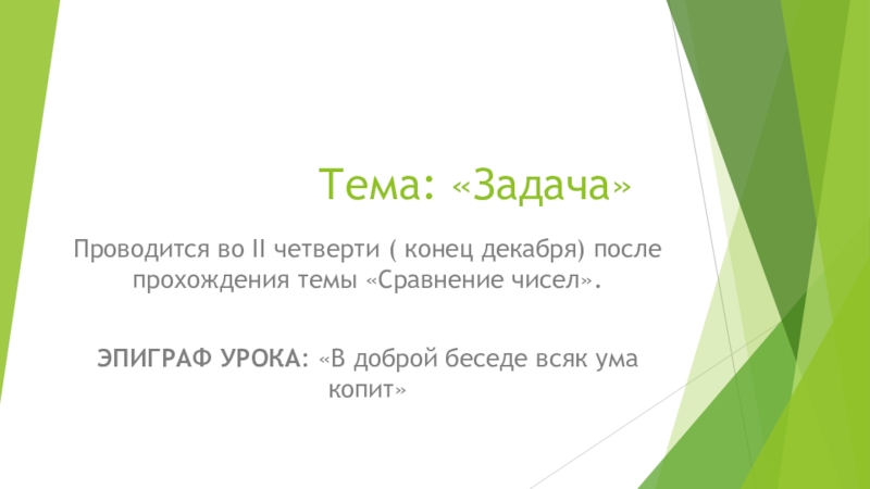 Тема: «Задача»Проводится во II четверти ( конец декабря) после прохождения темы «Сравнение чисел».ЭПИГРАФ УРОКА: «В доброй беседе всяк ума копит»