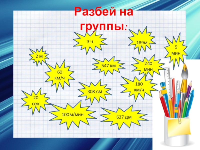 Разбей на группы:60 км/ч547 км240 мин100м/мин627 дм189м2 м3 ч308 см180 км/ч5 мин20 сек