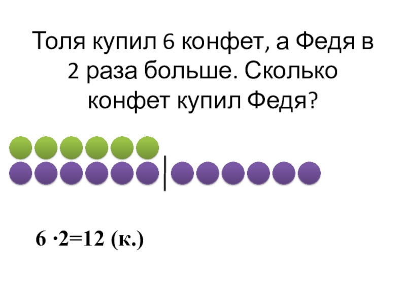 Толя купил 6 конфет, а Федя в 2 раза больше. Сколько конфет купил Федя?6 ∙2=12 (к.)