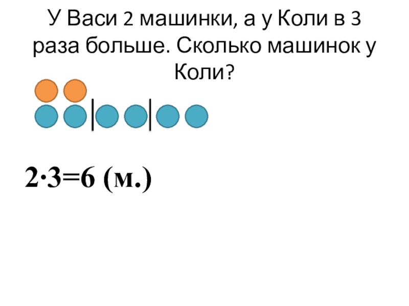 У Васи 2 машинки, а у Коли в 3 раза больше. Сколько машинок у Коли? 2∙3=6 (м.)