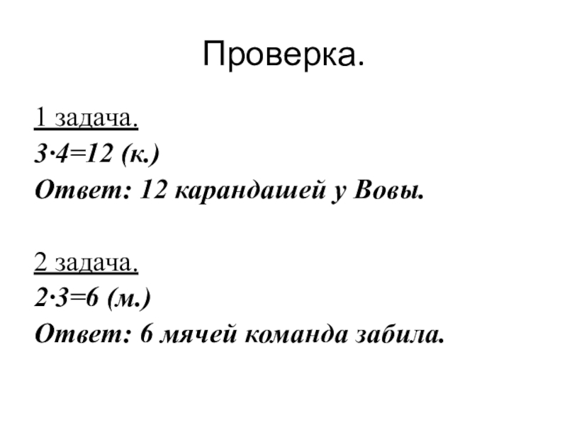 Проверка.1 задача.3∙4=12 (к.)Ответ: 12 карандашей у Вовы.2 задача.2∙3=6 (м.)Ответ: 6 мячей команда забила.