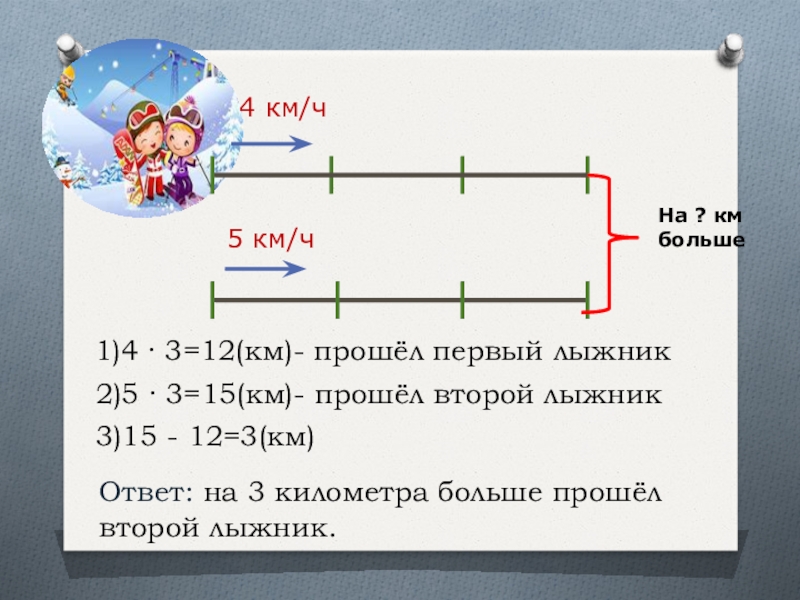 Ответ: на 3 километра больше прошёл второй лыжник.
