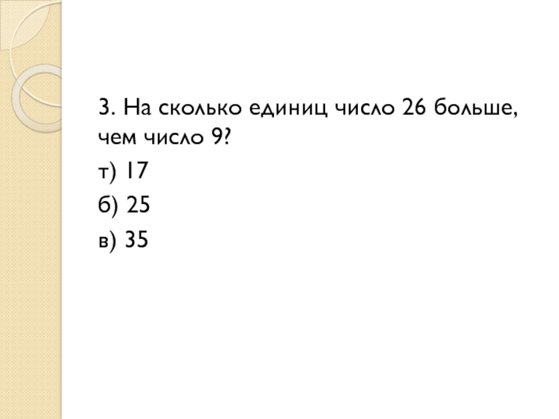 3. На сколько единиц число 26 больше, чем число 9?т) 17б) 25в) 35
