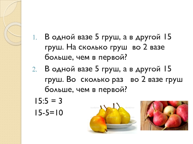Слайд 8В одной вазе 5 груш, а в другой 15 груш. На