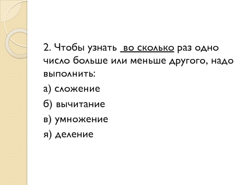 2. Чтобы узнать во сколько раз одно число больше или меньше другого, надо выполнить:а) сложениеб) вычитаниев) умножениея)