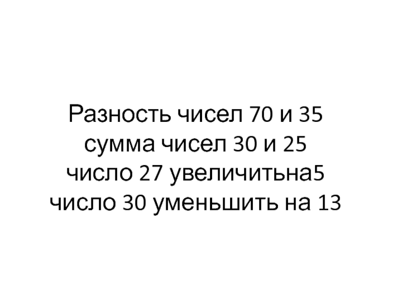 Слайд 7Разность чисел 70 и 35 сумма чисел 30 и 25 число 27 увеличитьна5 число