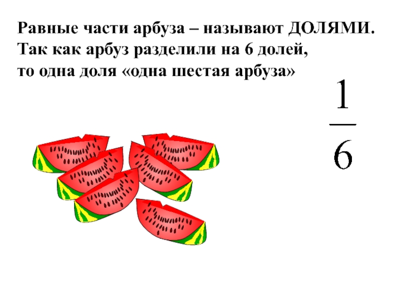 Равные части арбуза – называют ДОЛЯМИ.Так как арбуз разделили на 6 долей, то одна доля «одна шестая