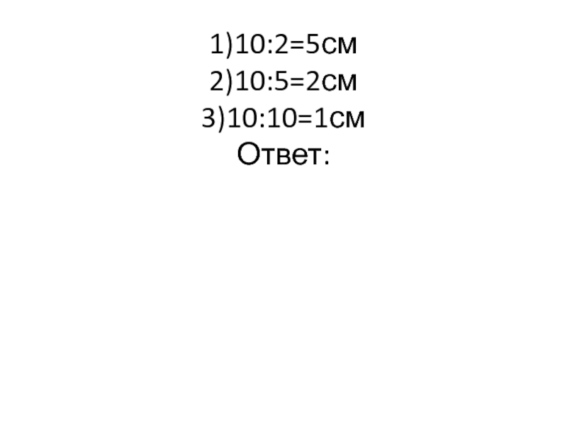 Слайд 131)10:2=5см 2)10:5=2см 3)10:10=1см Ответ: