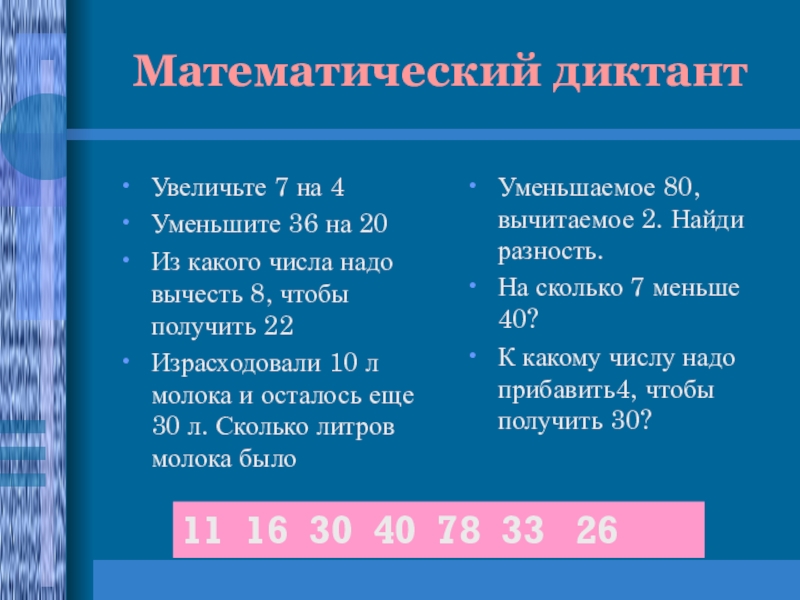 Уменьшаемое 80, вычитаемое 2. Найди разность.