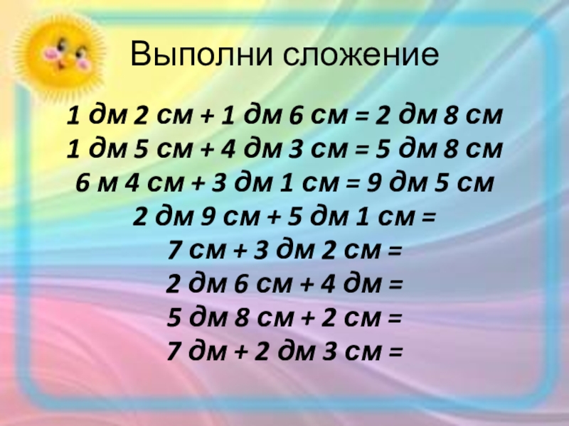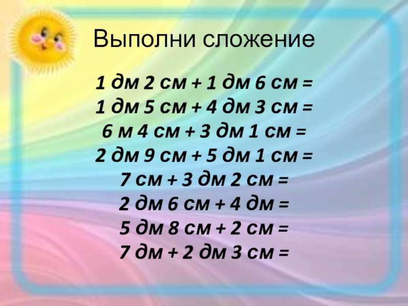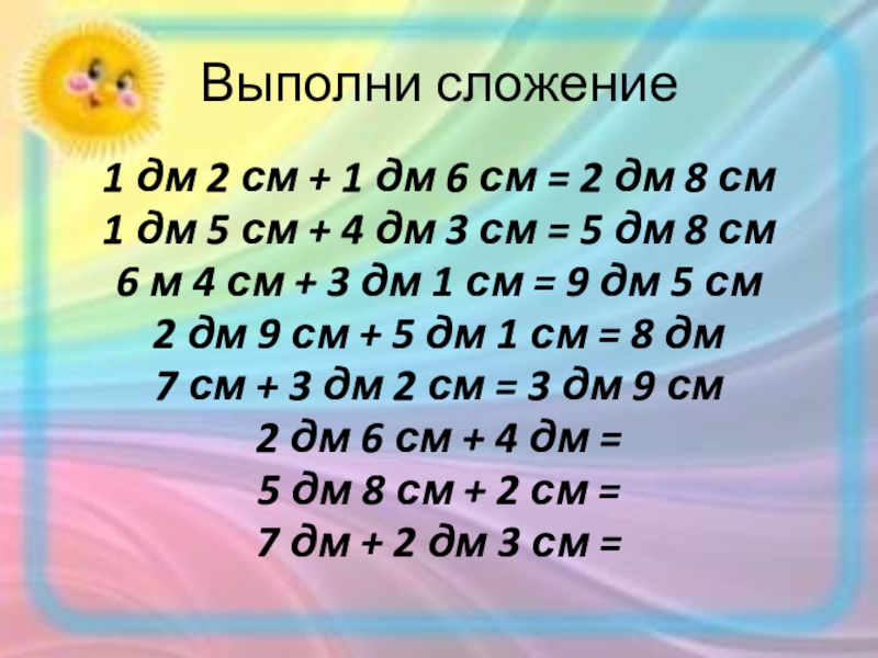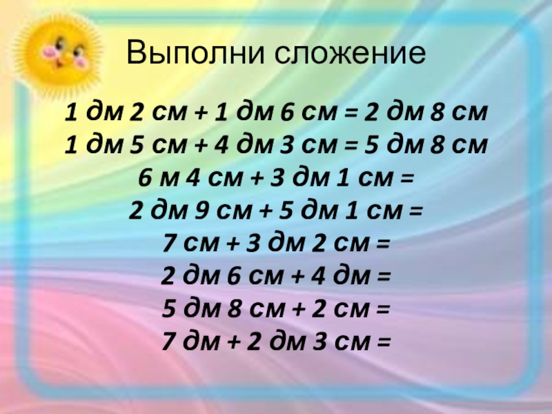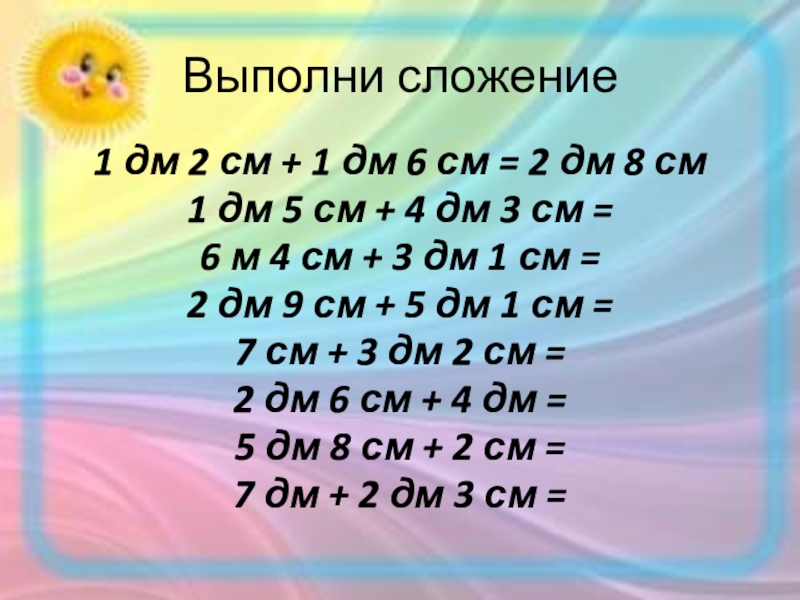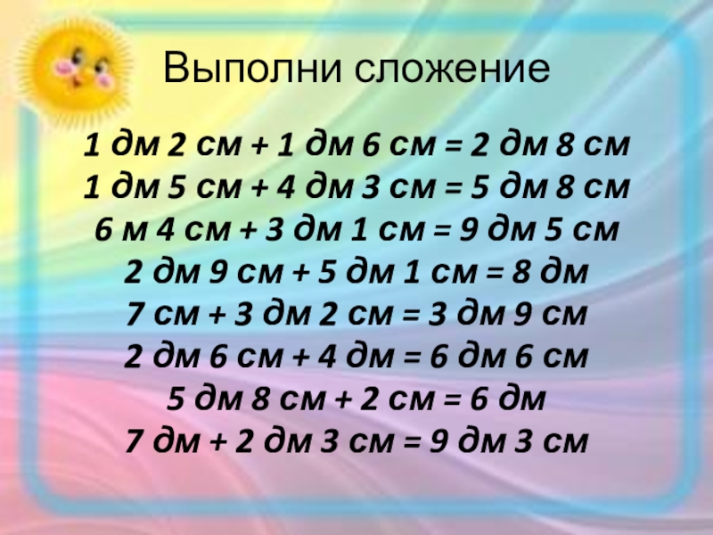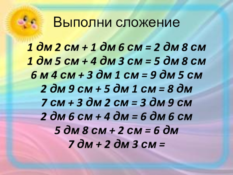 7 дм + 2 дм 3 см = 9 дм 3 см