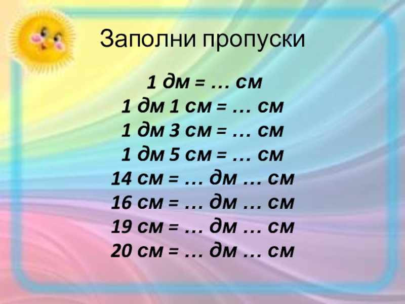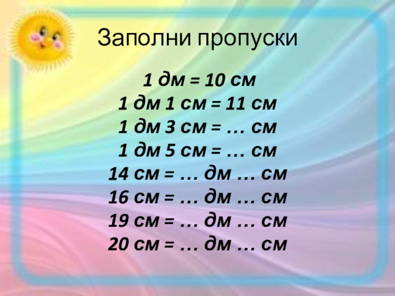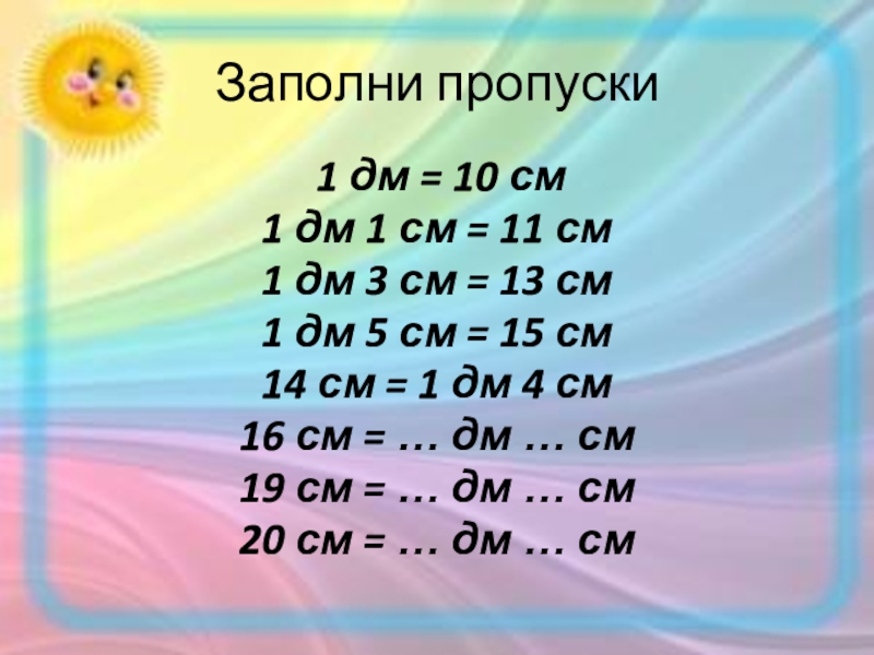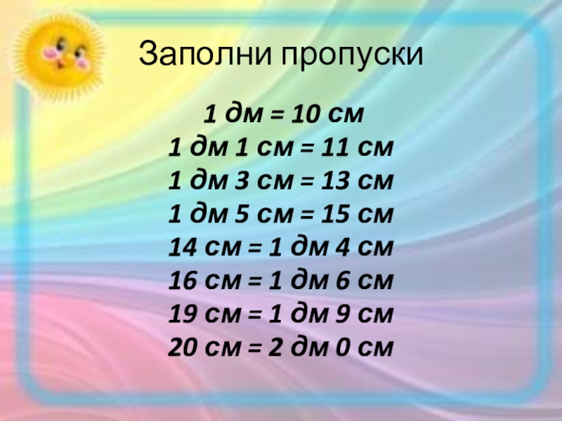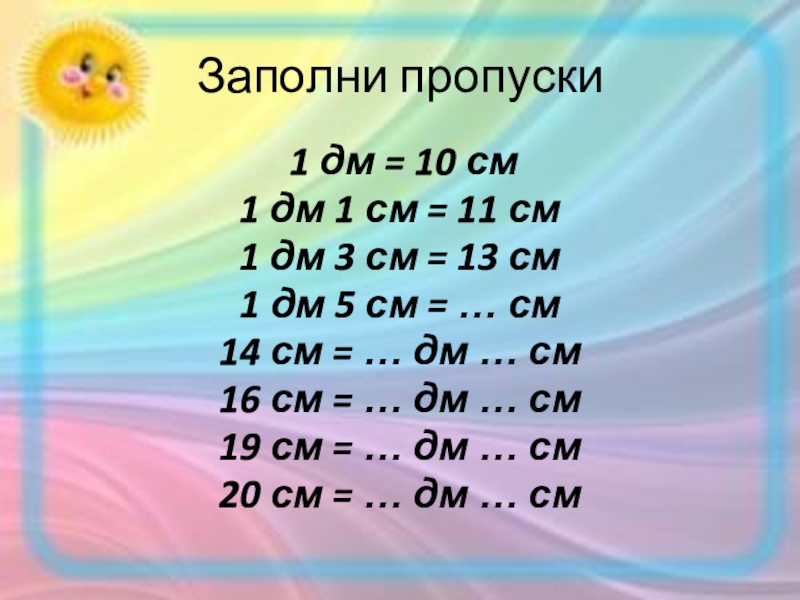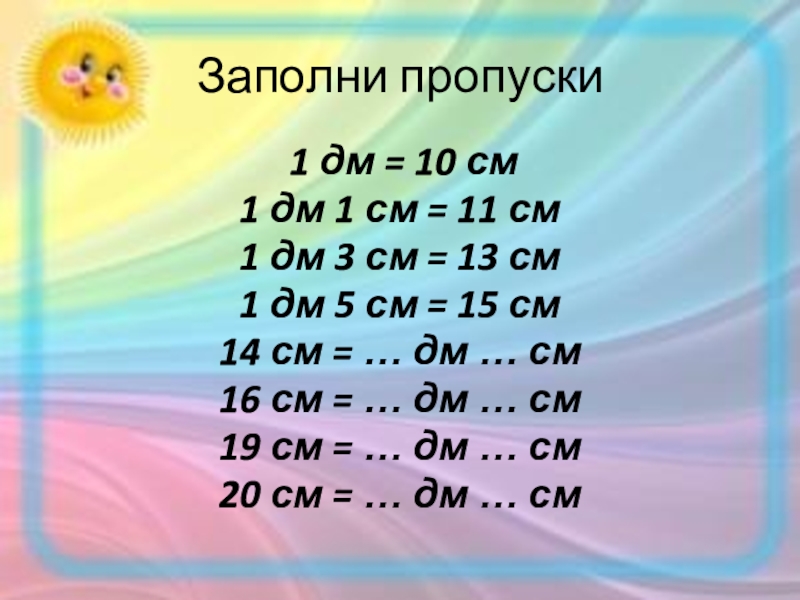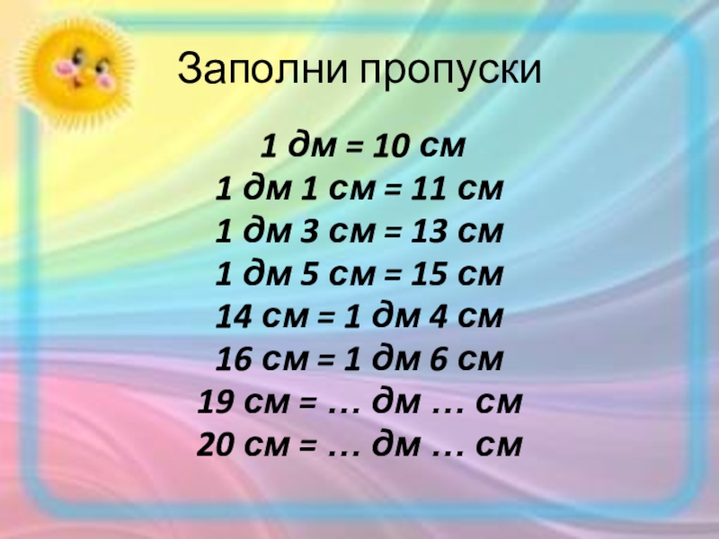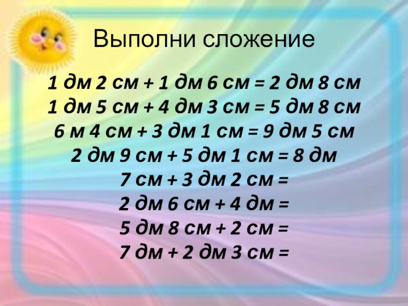 7 дм + 2 дм 3 см = 9 дм 3 см