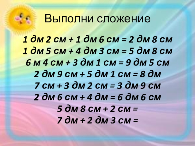 1 дм 5 см + 4 дм 3 см = 5 дм 8 см