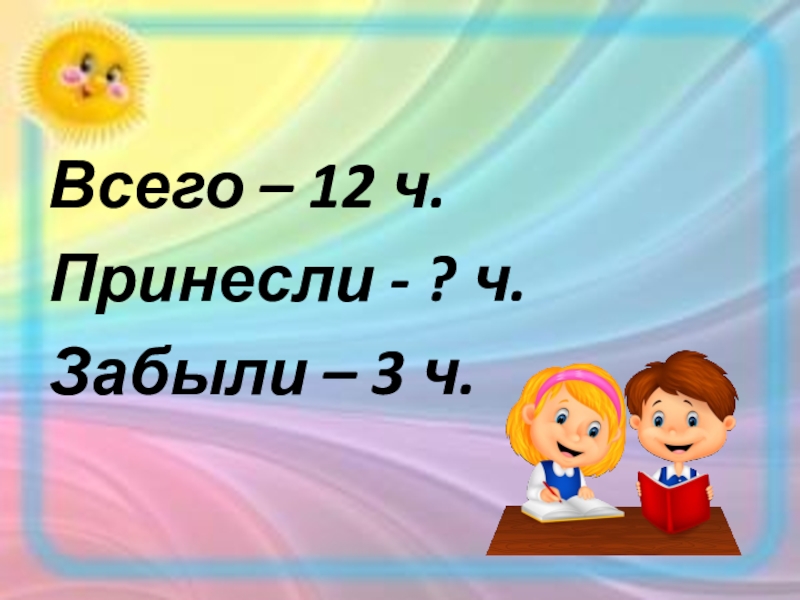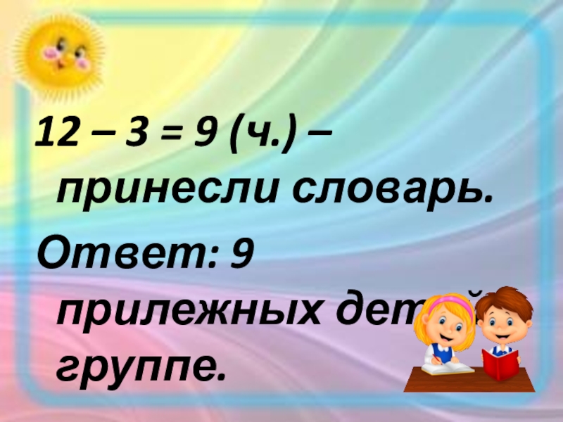 Слайд 1312 – 3 = 9 (ч.) – принесли словарь.