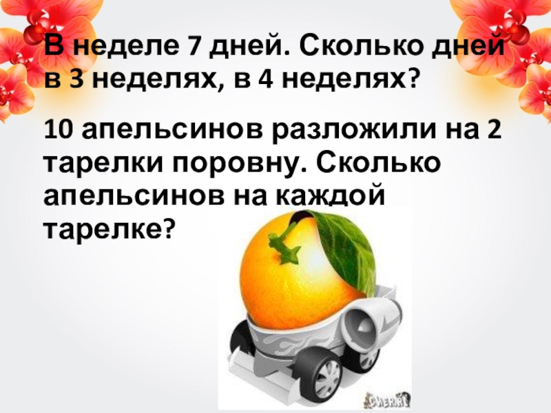 10 апельсинов разложили на 2 тарелки поровну. Сколько апельсинов на каждой тарелке?