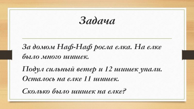 Задача За домом Наф-Наф росла елка. На елке было много шишек.Подул сильный ветер и 12 шишек упали.