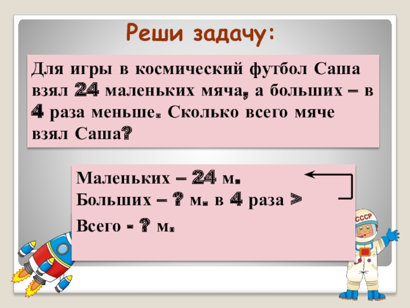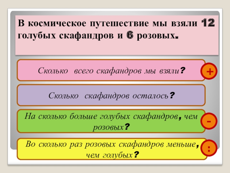 В космическое путешествие мы взяли 12 голубых скафандров и 6 розовых.