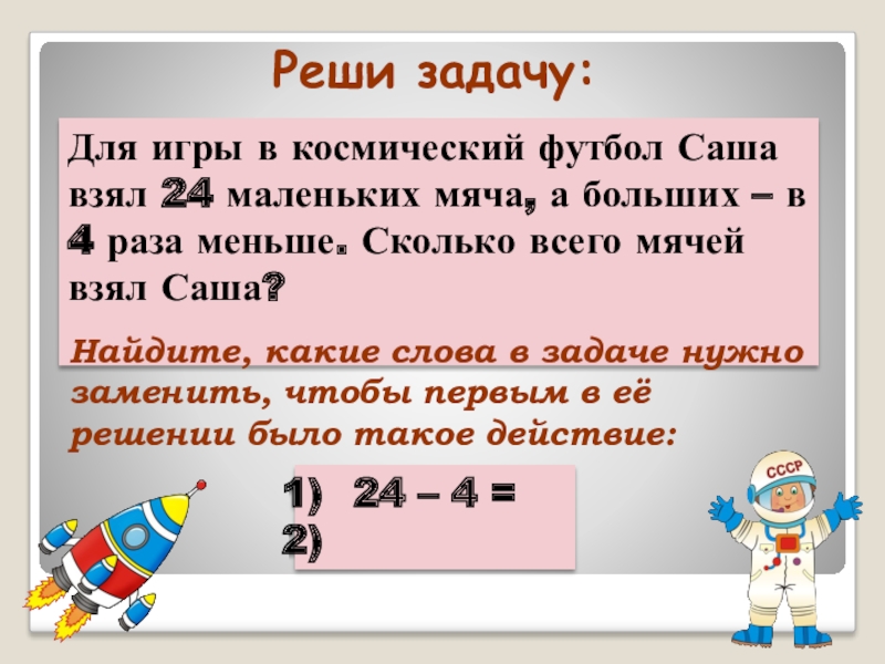 Найдите, какие слова в задаче нужно заменить, чтобы первым в её решении было такое действие: