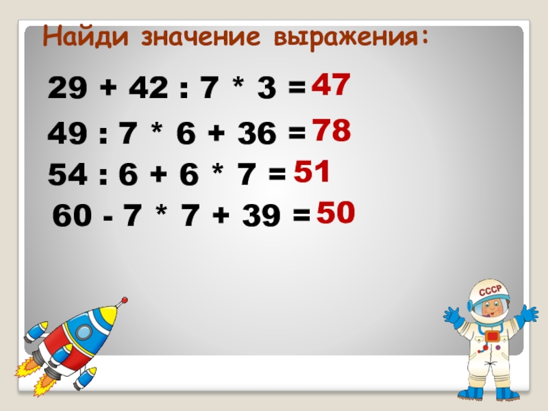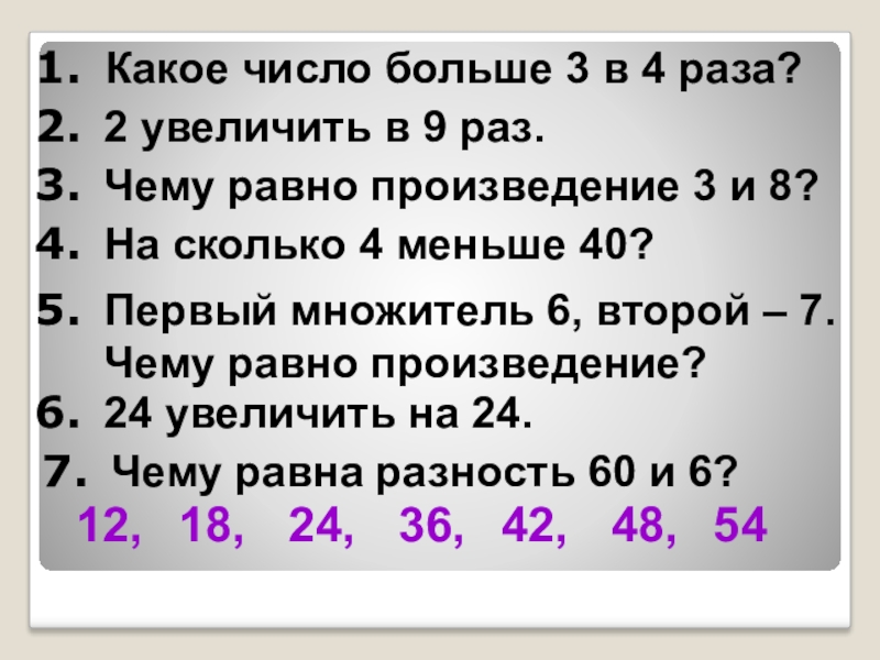 Первый множитель 6, второй – 7. Чему равно произведение?