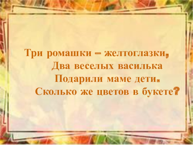 Три ромашки – желтоглазки,    Два веселых василька    Подарили маме