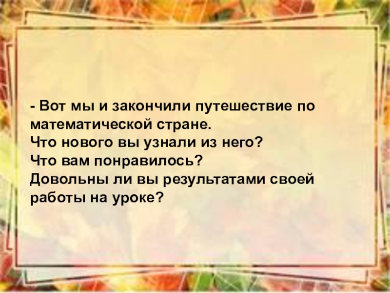 - Вот мы и закончили путешествие по математической стране. Что нового вы узнали из него?Что вам понравилось?Довольны