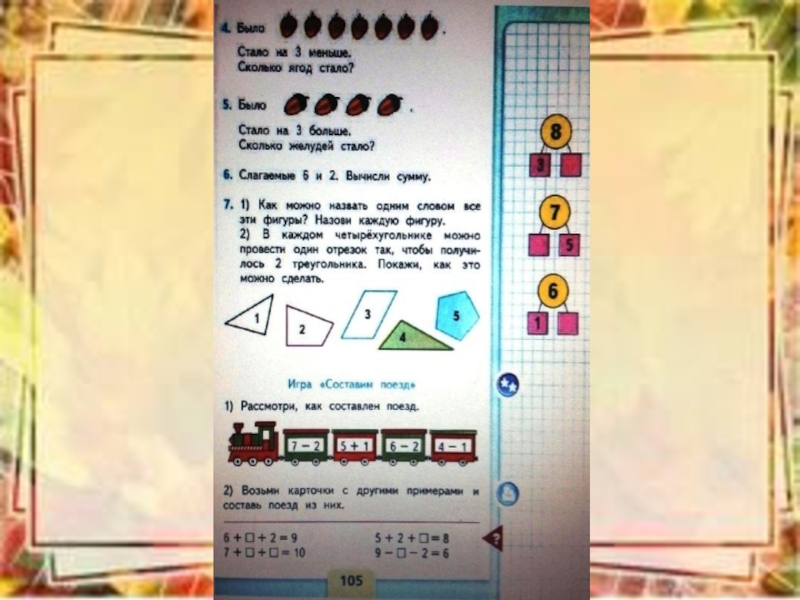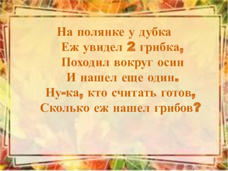 На полянке у дубка    Еж увидел 2 грибка,    Походил вокруг осин
