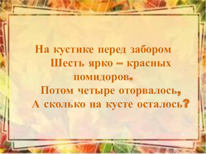 На кустике перед забором   Шесть ярко – красных помидоров.   Потом четыре