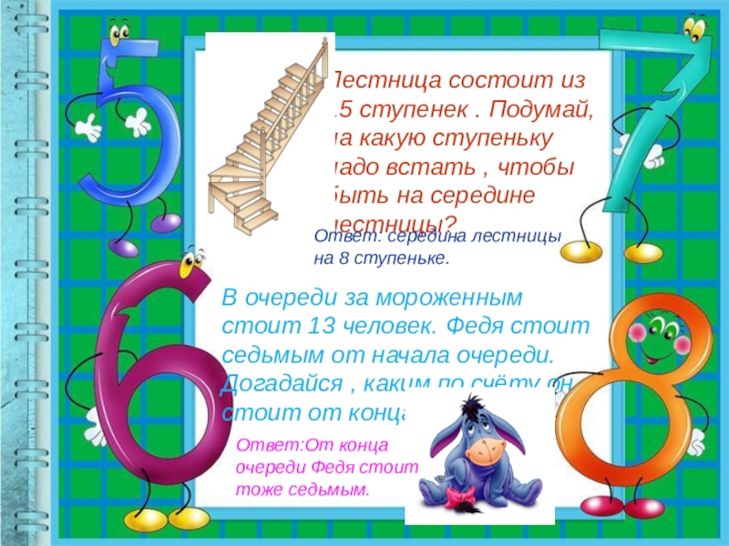 В очереди за мороженным стоит 13 человек. Федя стоит седьмым от начала очереди. Догадайся , каким по счёту он стоит от конца очереди?