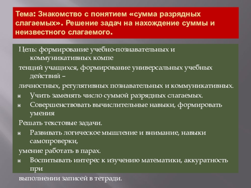 Учить заменять число суммой разрядных слагаемых.