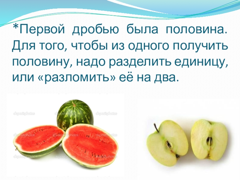 Слайд 7*Первой дробью была половина. Для того, чтобы из одного получить половину,