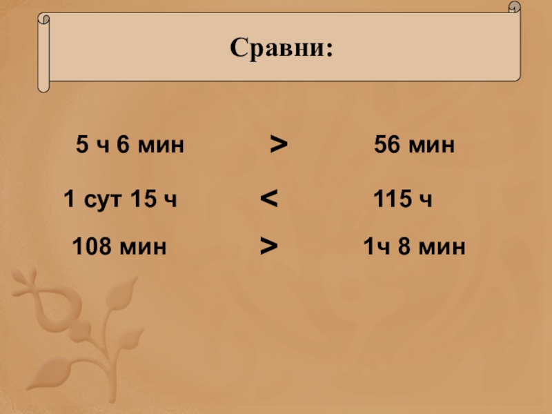Сравни:5 ч 6 мин56 мин>1 сут 15 ч 115 ч